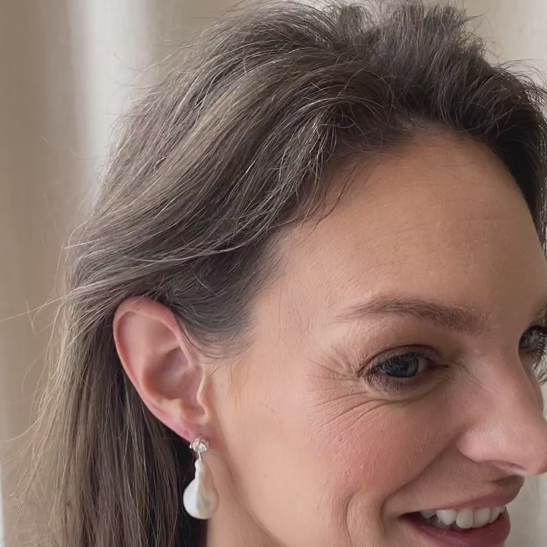 Our Large Pearl Crystal Statement Stud Drop Earrings are meticulously crafted by hand using authentic freshwater pearls and premium metals in either 925 sterling silver or 18ct gold plated on sterling silver.